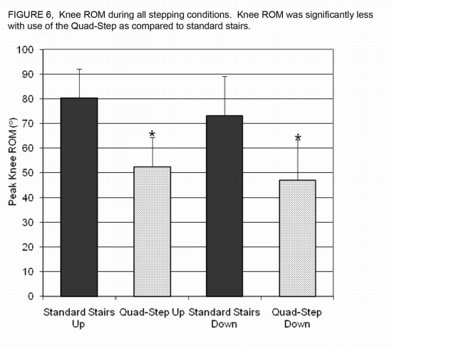 Hip ROM was found to be significantly less with the Portable Quad-Step during stair climbing, but not during descent. However, the knee joint showed significant reductions in knee ROM during both ascent and descent with the Portable Quad-Step device. Results of this study were similar to the results of other studies. Lark et al. (2004) also found that hip and knee flexion increased with increases in step height. Hip and knee ROM as well as joint moments increase with increases in stair inclination and step height (Riener, Rabuffetti, & Frigo, 2002).